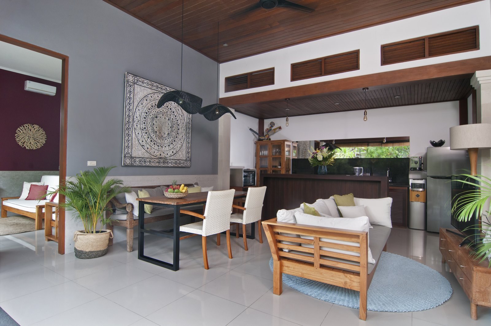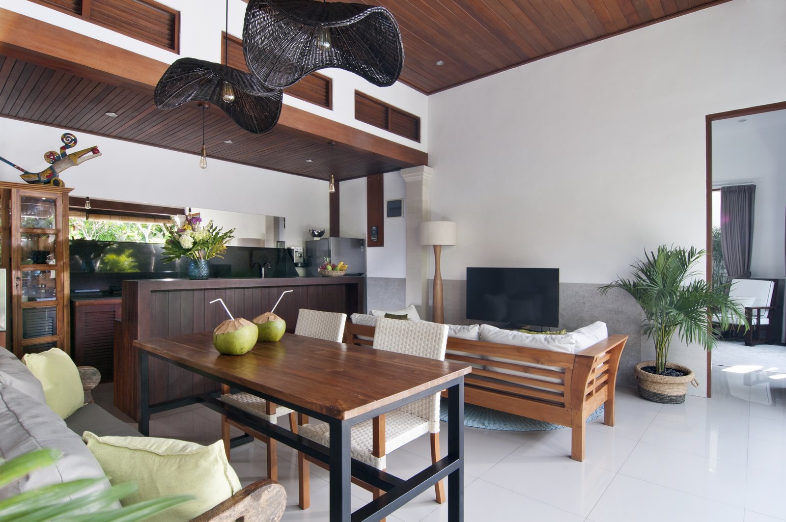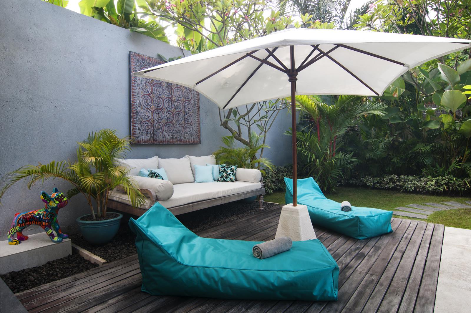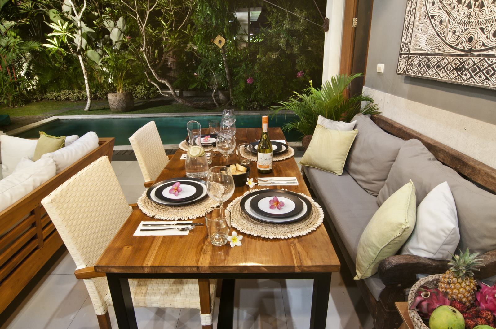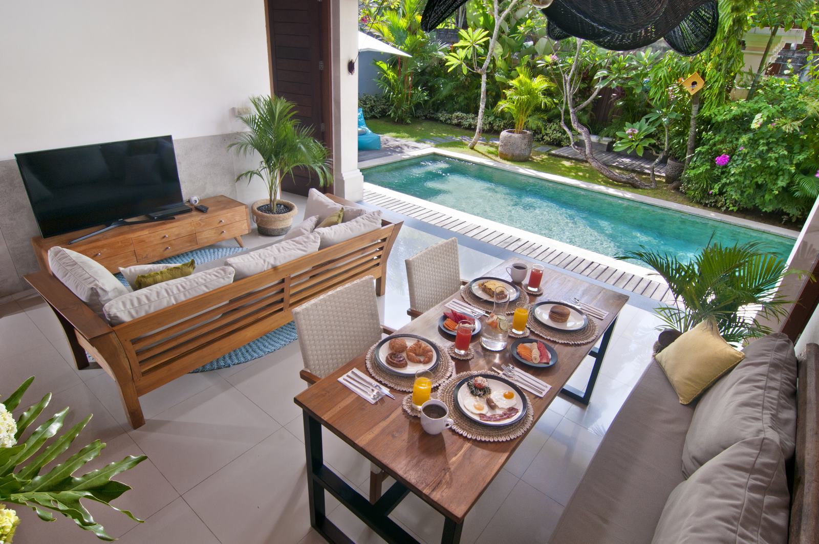 The lush tropical garden and open-air living room embody ideal tropical living while adhering to western standards in cozy design and furnishings.