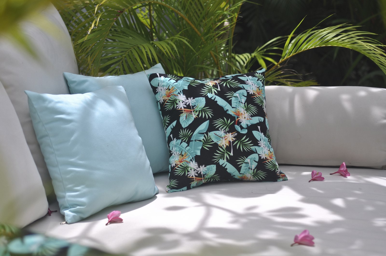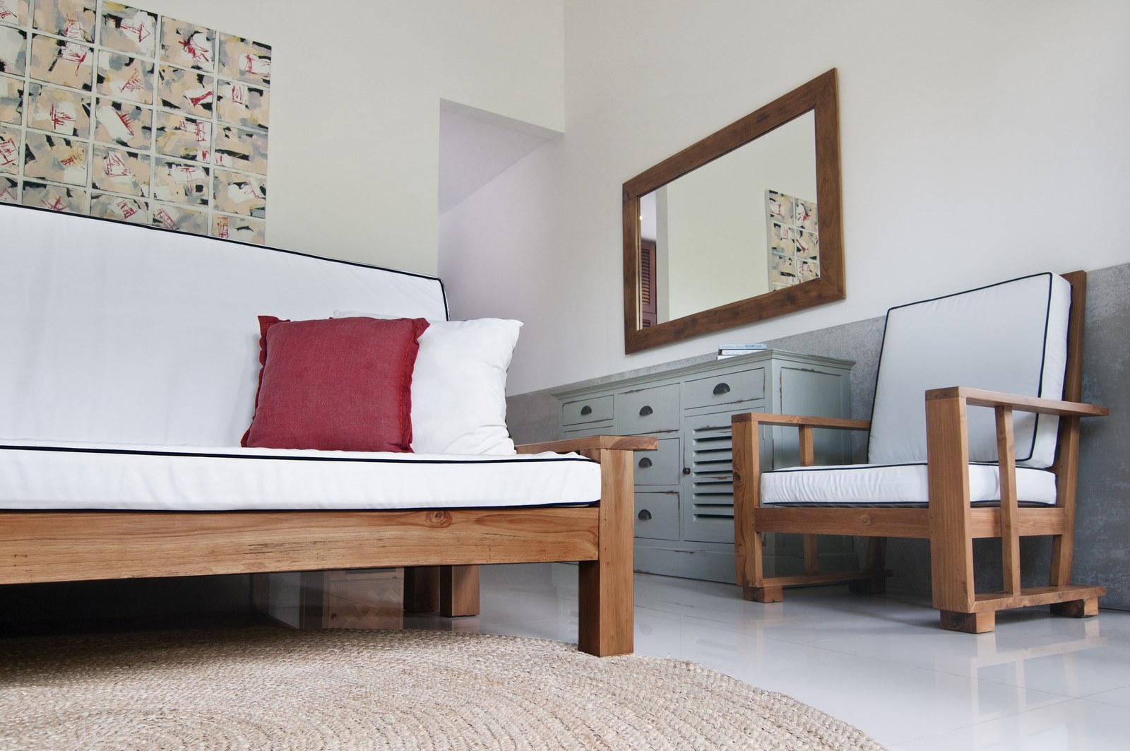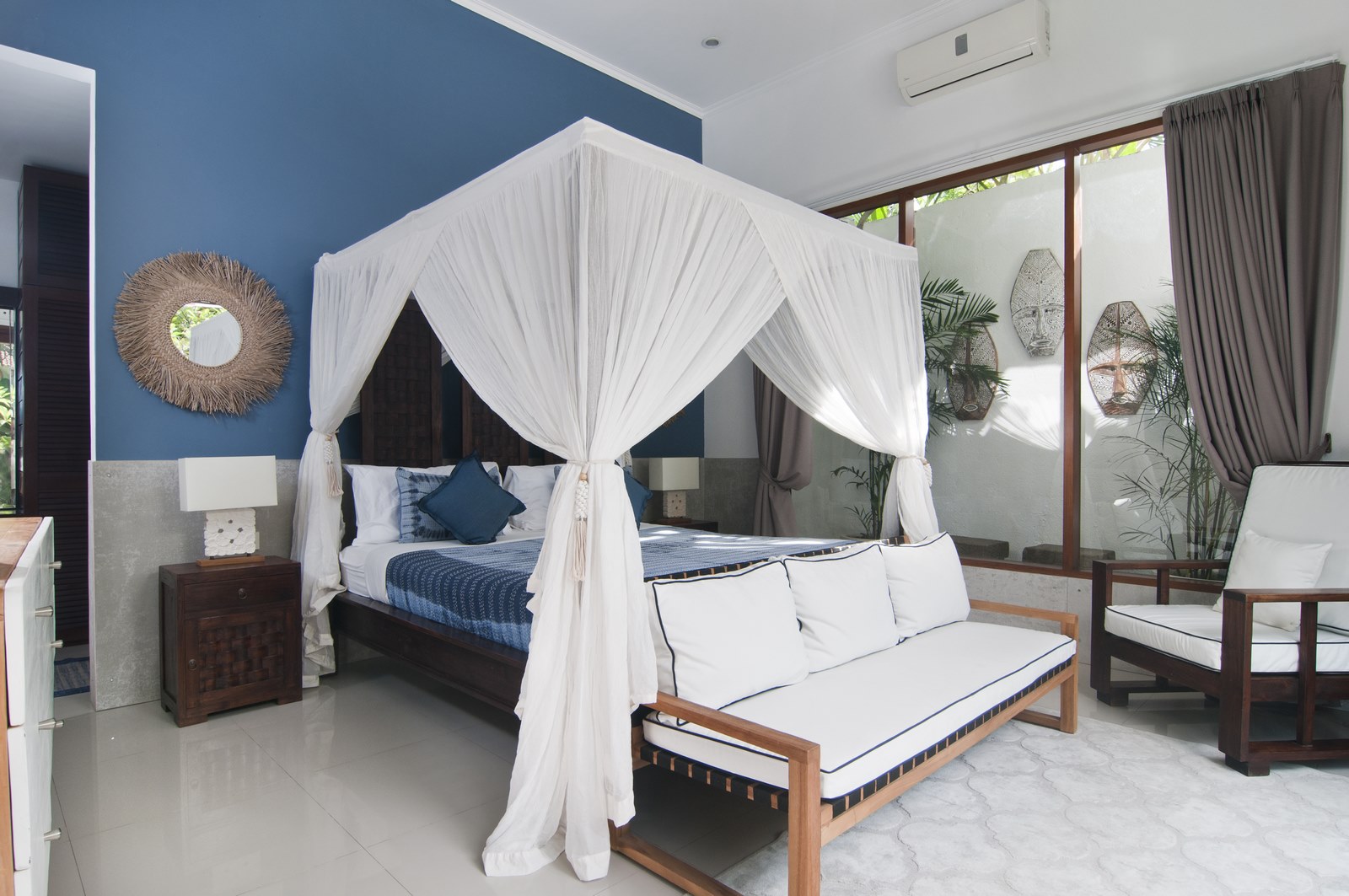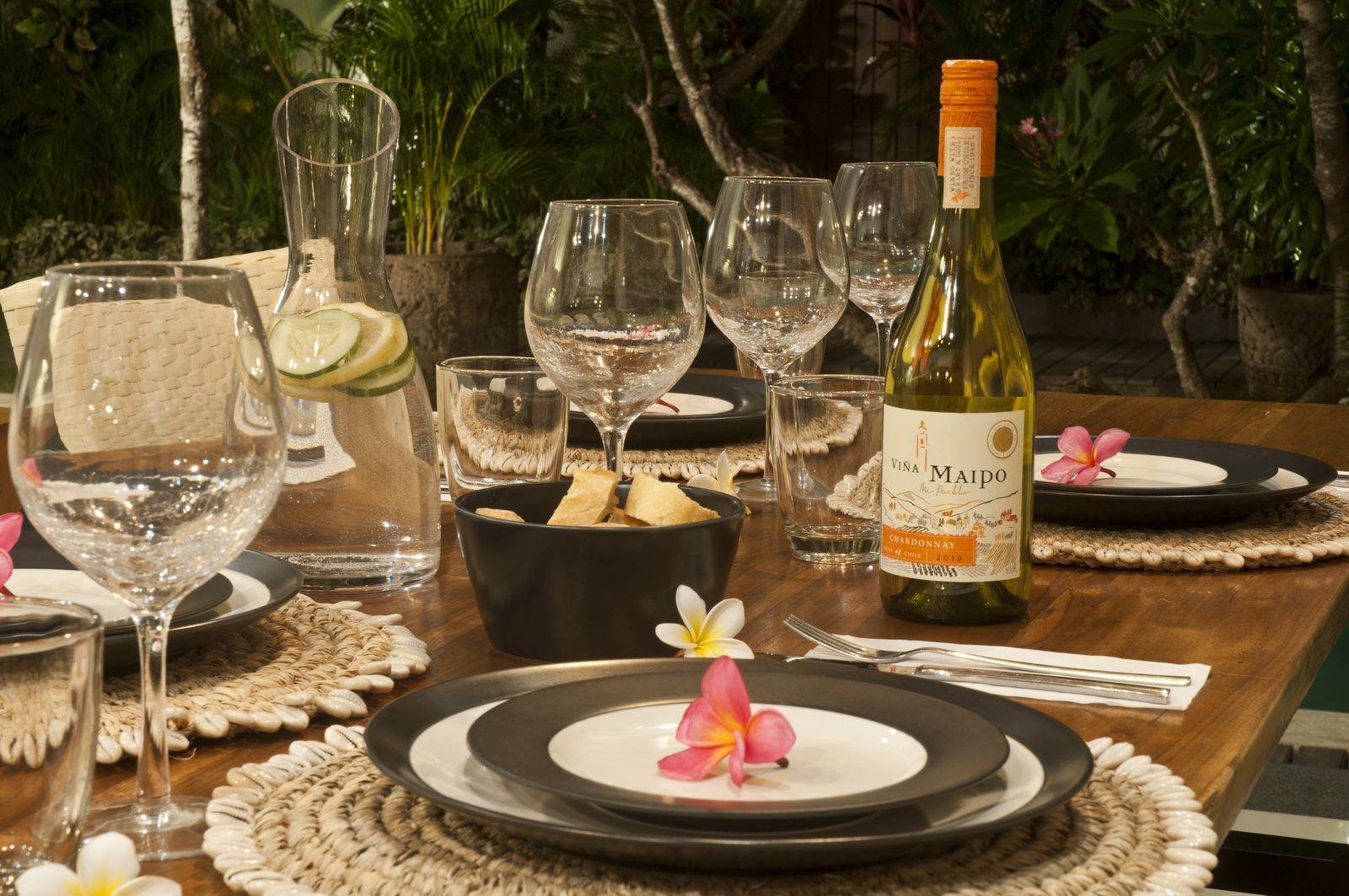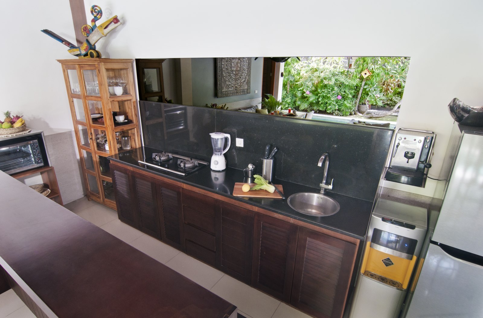 The lush tropical garden and open-air living room embody ideal tropical living while adhering to western standards in cozy design and furnishings.