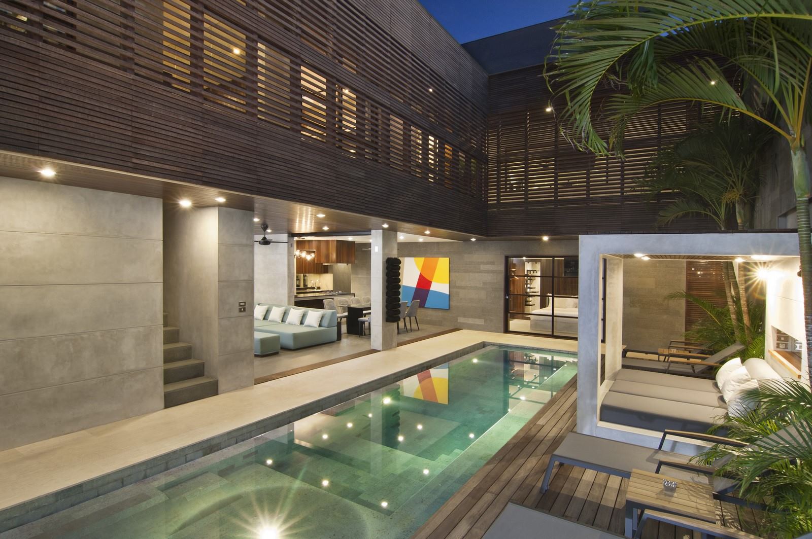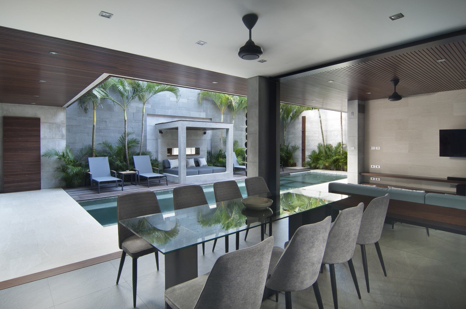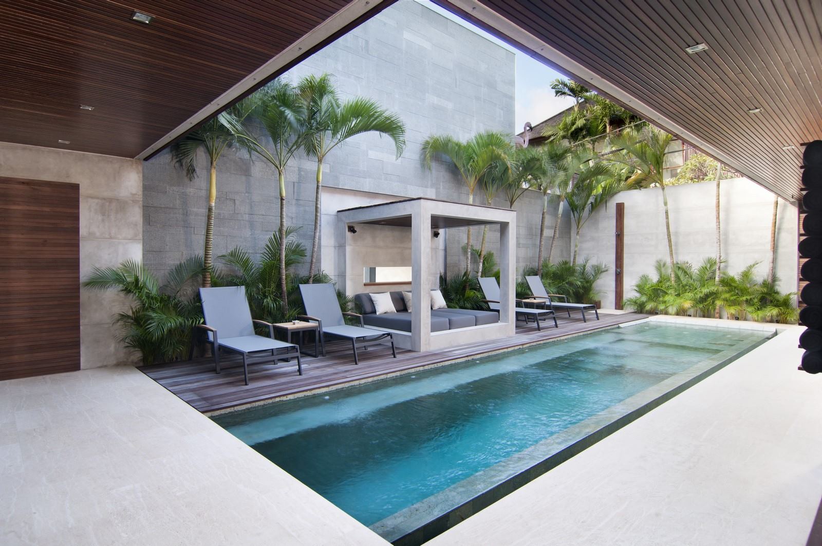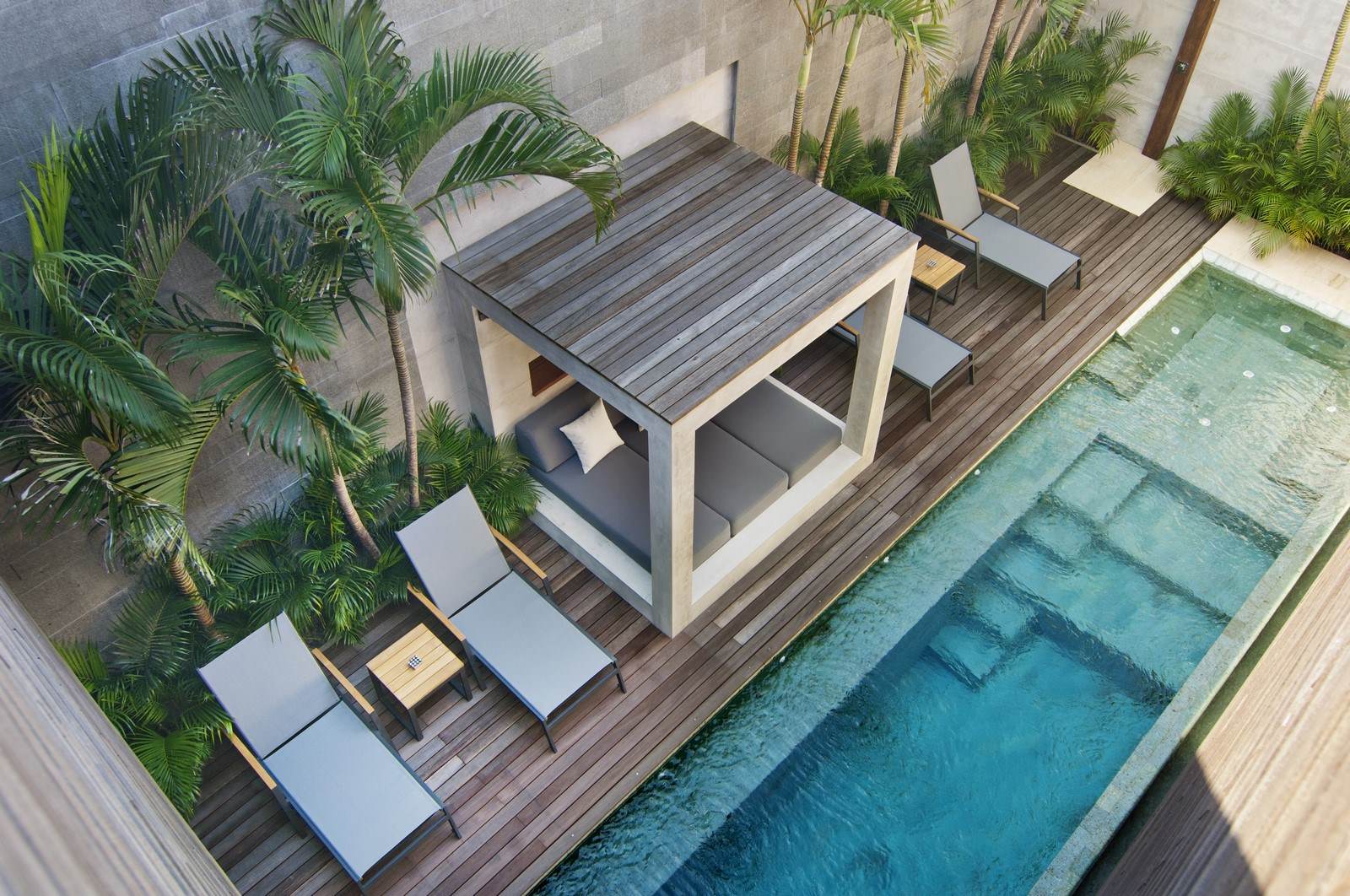 A modern tropical living, designed with natural wood and stone accents, enhances the contemporary aesthetic, featuring a private gym and a poolside lounge gazebo for ultimate relaxation.