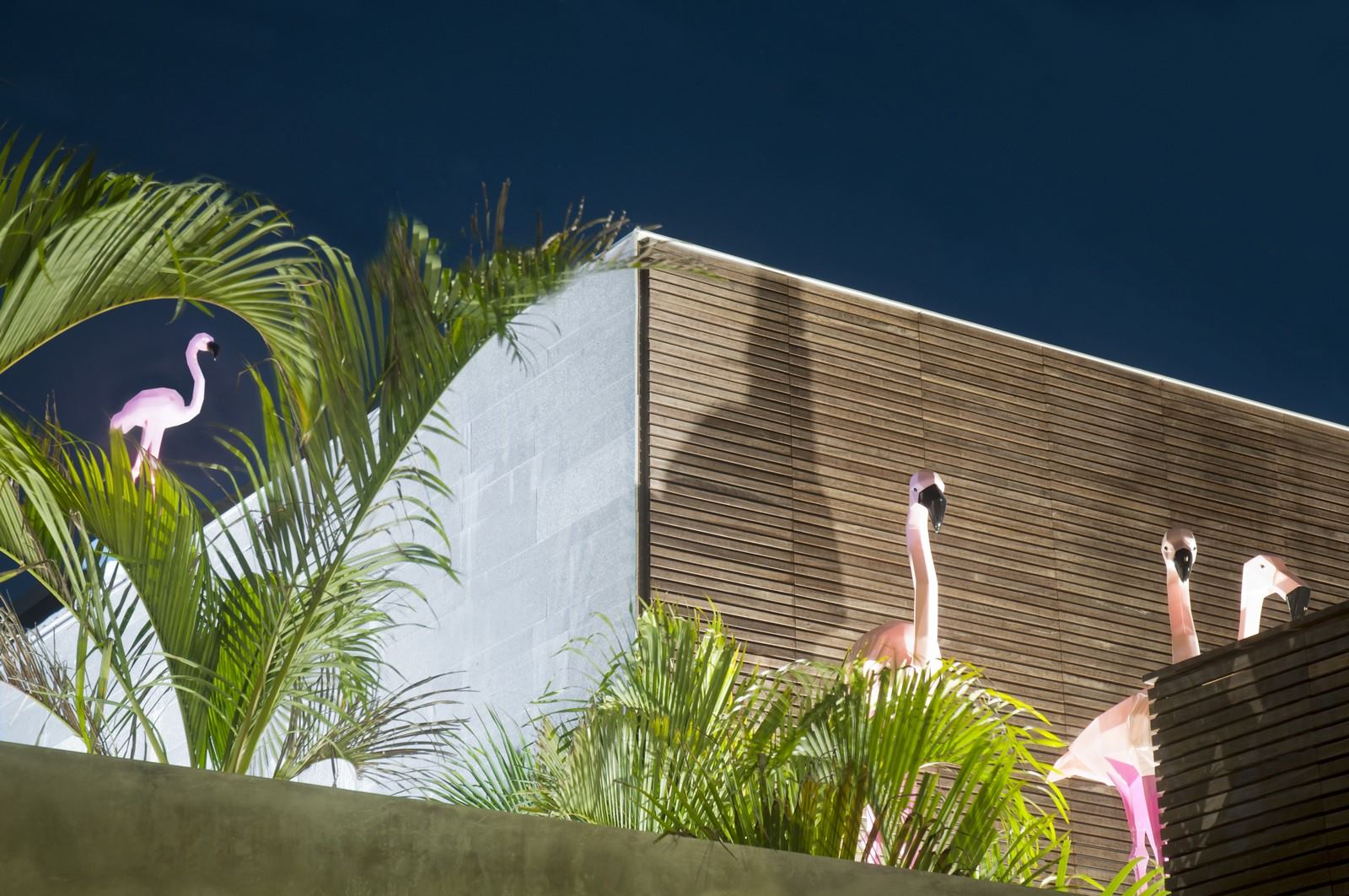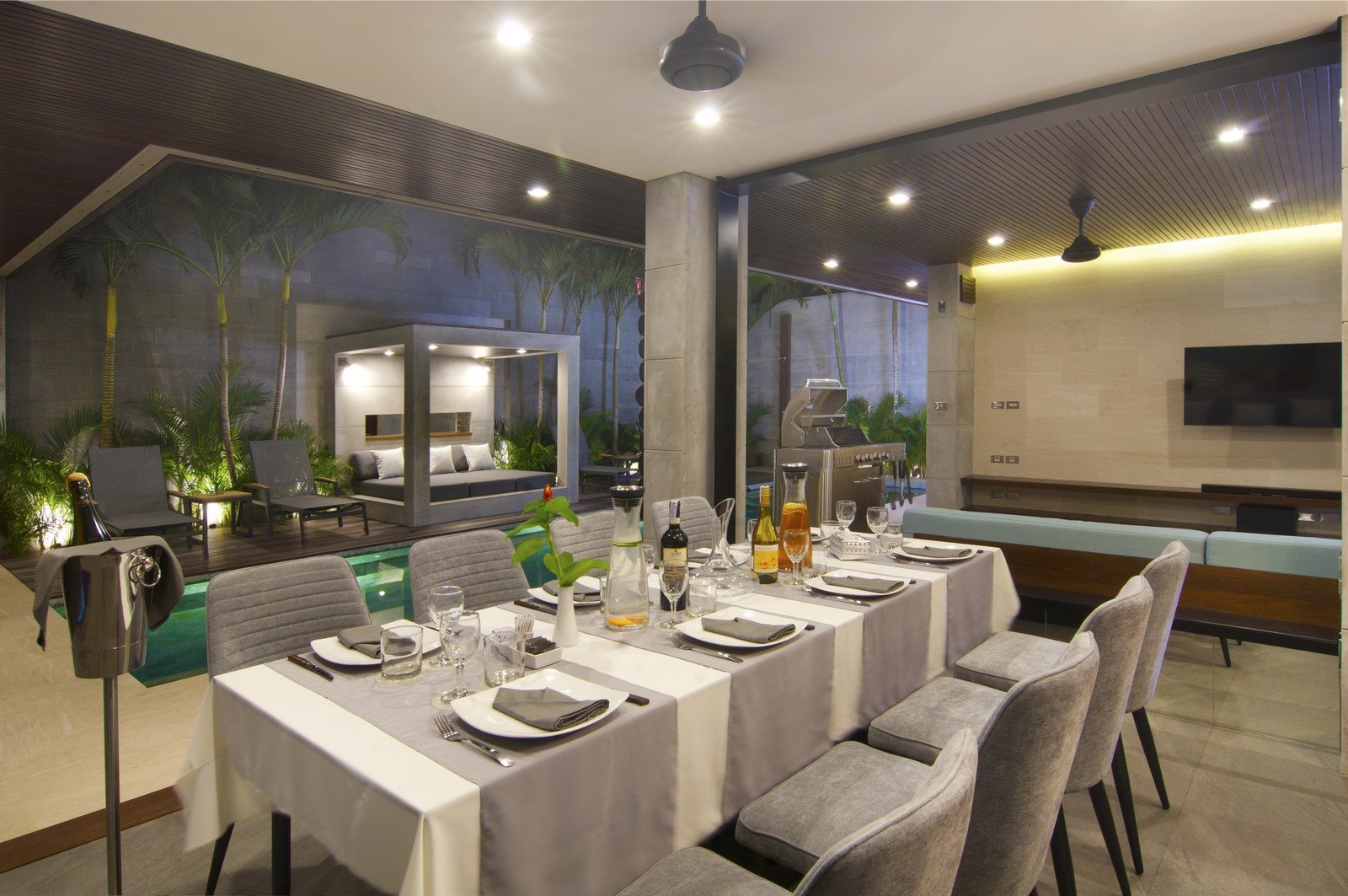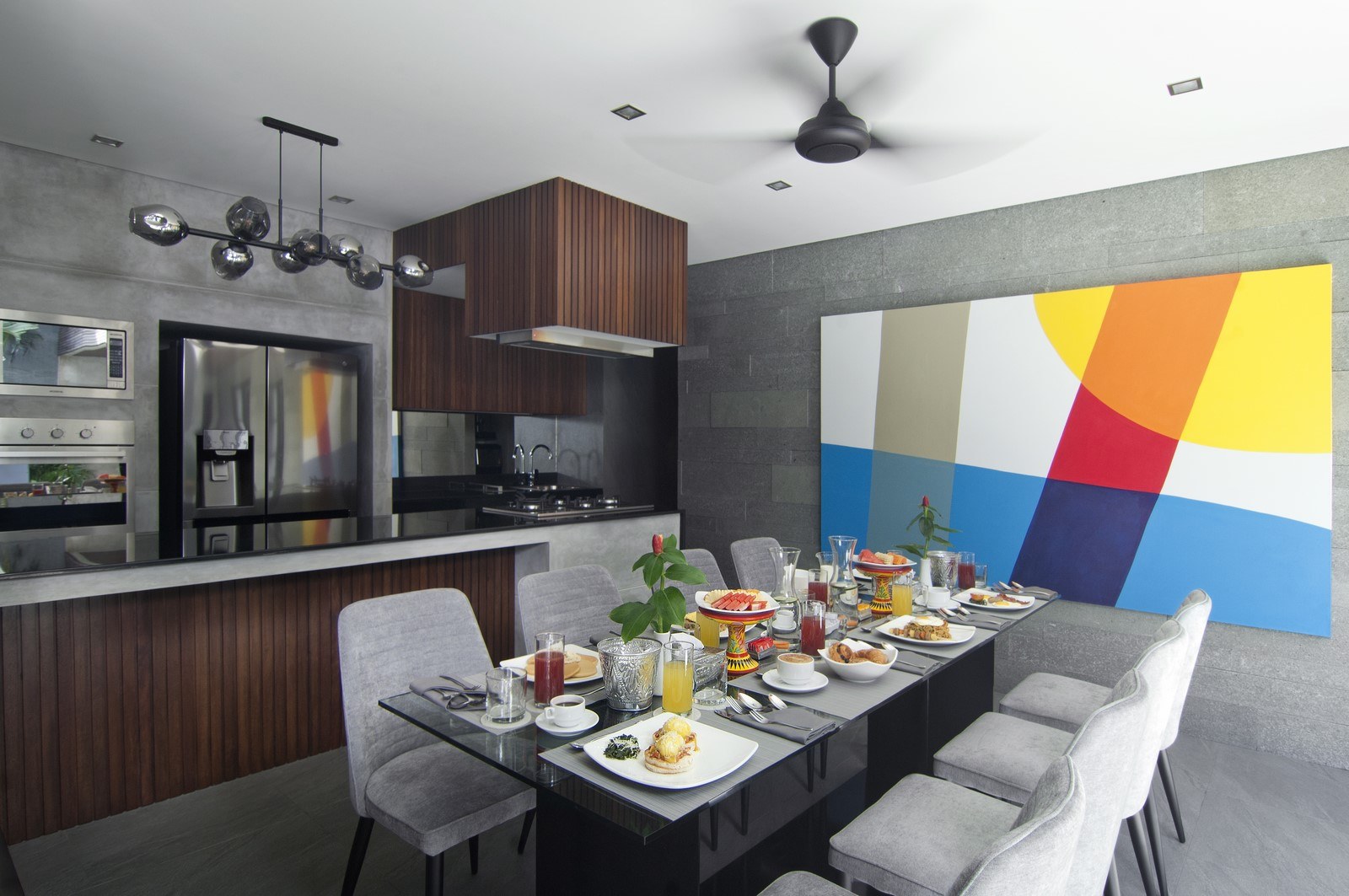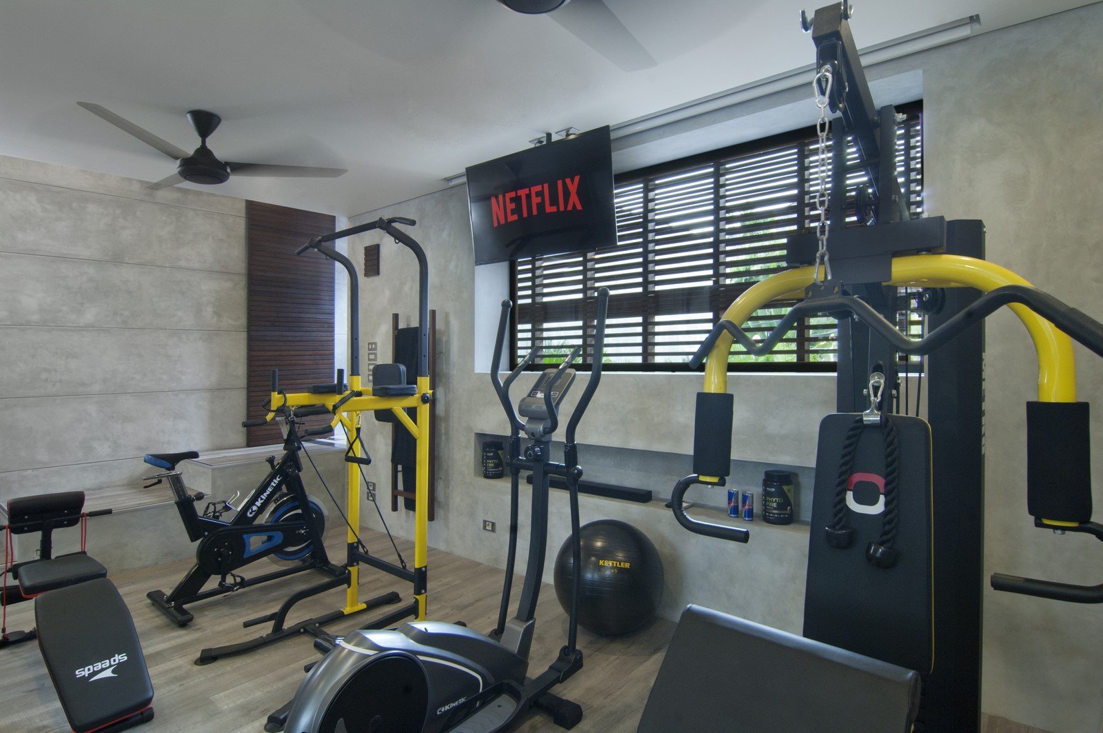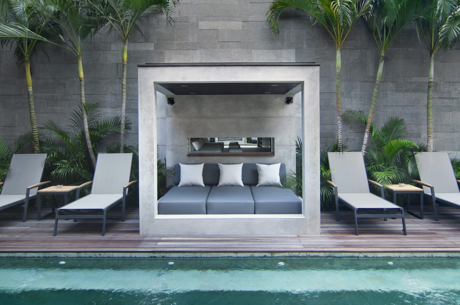 A modern tropical living, designed with natural wood and stone accents, enhances the contemporary aesthetic, featuring a private gym and a poolside lounge gazebo for ultimate relaxation.